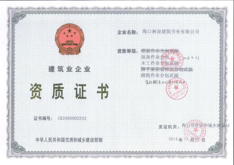 海口樹泉建筑勞務有限公司成立于2011年,公司位于???,其前身是一家專業(yè)建筑施工隊,自2004年即開始在海南從事建筑勞務施工。自成立至今,公司已經(jīng)擁有一支科學管理、質量過硬、能打硬仗,搶工期的專業(yè)隊伍。能獨立承擔大中型工業(yè)與民用建筑 、室內外裝修、各類機電設備安裝工程。代表工程有??跒I海華庭、三亞時代海岸T01/02/04/05棟高層、合肥東?;▓@二期、陵水富力灣B區(qū)高層、三亞金中海(酒店)、瓊海大印經(jīng)典花園、??诃h(huán)球海景大酒店(四星級酒店,在建中)、陵水珍珠大廈(五星酒店)、海口萬達廣場、美蘭機場二期。